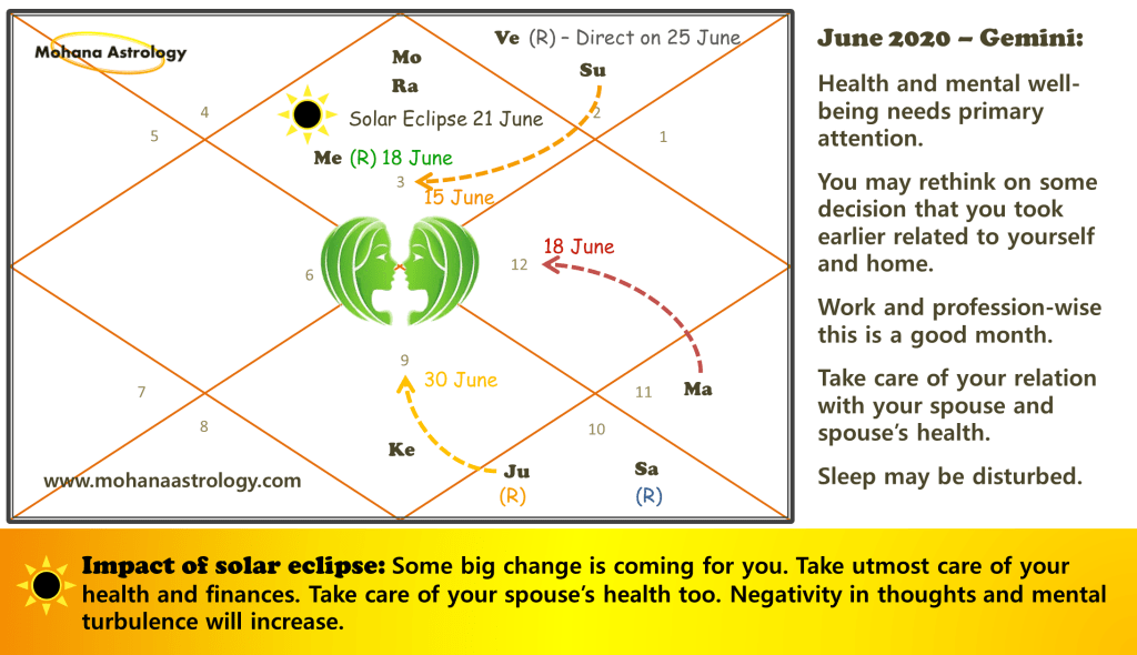 Sun is transiting from Taurus to Gemini on June 15, 2020 and on 21 June there will be an annular solar eclipse in Gemini. The solar eclipse on 21 June exudes full impact for next 3 to 6 months. Since most of the major planets are retrograde during this solar eclipse, the result will relate to settling or clearing past karmic burden for all of us. Gemini, Sagittarius and Virgo will be most impacted sign-wise. The solar eclipse is involving two nakshatras, Ardra and Mrigashira. Therefore people having moon or ascendant on these two nakshatras will be greatly impacted too. Mars will be aspecting the eclipse and all planets placed in Gemini from 18 June. Therefore, this solar eclipse may trigger agitation and violence as well. It may also prompt some unpleasant events impacting world peace. This is also getting support from four retrograde planets. There may be sudden and repeated natural and geophysical calamities and further spread of infectious diseases. Therefore it is important to take care of health.
