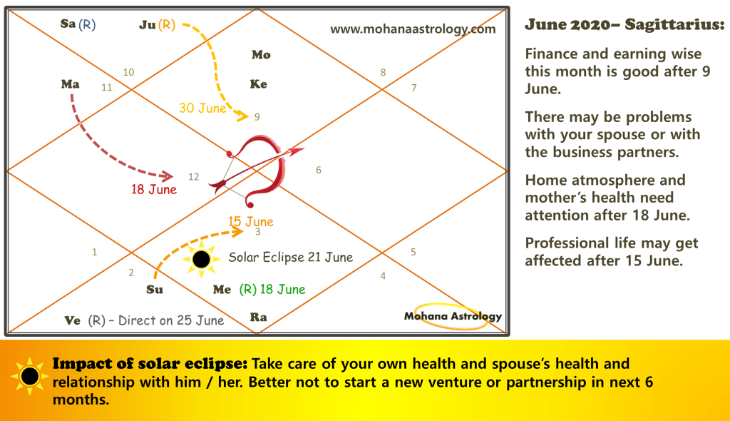 Jupiter and Saturn remain retrograde together in Capricorn the entire month; you cannot expect any change in the impact of these two planets from last month. Hard work, low financial gain and distorted view of knowledge and wisdom predominate our lives. It would be better if you can modify yourselves for a minimalist and disciplined life. The important event here is Jupiter’s move back to Sagittarius on the last day of the month. I shall discuss the effects of Retrograde Jupiter in Sagittarius in July.