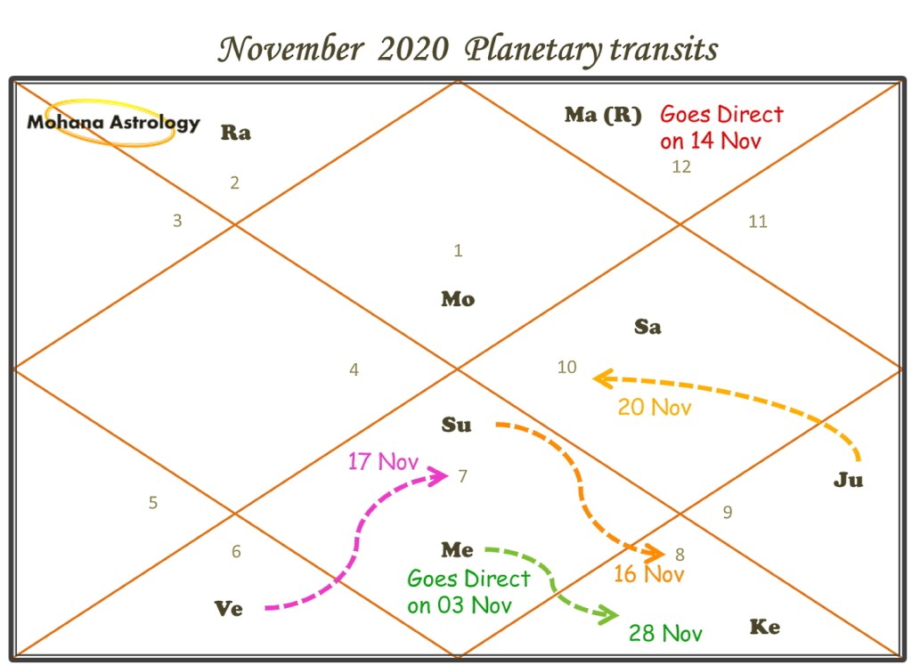 Mars is turning direct in the sign of Pisces on 14 November. Although Mars in Pisces is still very imbalanced, impulsive and emotional, with end of retrogression, the Karmic baggage associated with it will end. It will be a forward looking Mars heading towards Aries. Mars will have Saturn’s aspect which will obstruct Mars to take any actions. I feel in one way this is actually good because this restricts the impulsive, emotional actions.
