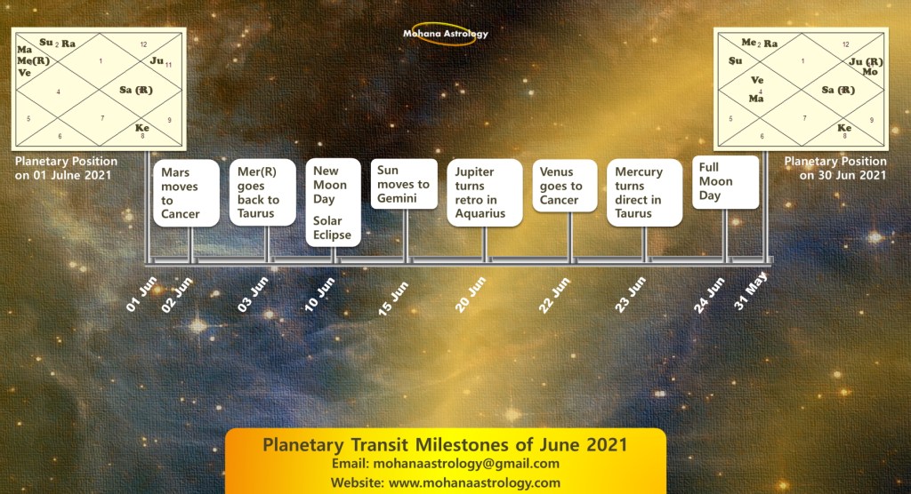 Let us first see the transits of planets in June. Three planets are retrograde in June. Saturn and Mercury are already retrograde; Jupiter turns retrograde on 20 June in Aquarius. Therefore between 20 June and 23 June all three planets, i.e. Mercury, Saturn and Jupiter will be retrograde.