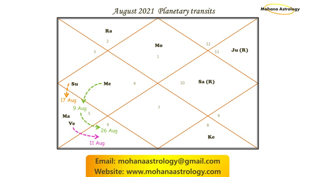 Slow moving planets are in the same status and placed in the same signs as in July; i.e. Jupiter and Saturn are retrograde are in Aquarius and Capricorn respectively. Rahu and Ketu are in Taurus and Scorpio.