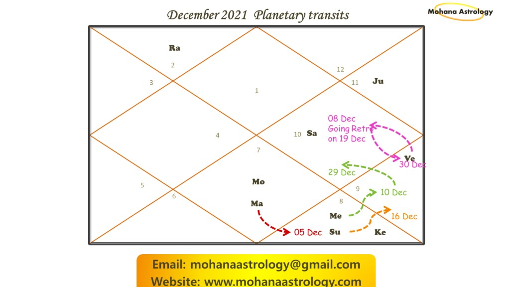 I am going to discuss the Vedic horoscope for December 2021 as per Moon signs and also the results of the upcoming solar eclipse on 4th December. Let us first see the positions of the planets in the sky in December. All dates are as per Indian Standard Time.