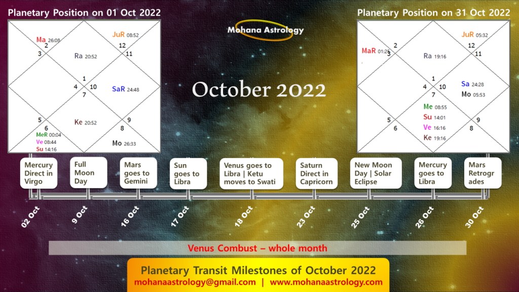 The next big event in October is Saturn’s direct motion on 23rd. This is a much awaited relief. If you have taken care of all the pending work that were supposed to be done during the retrogression and corrected your ways, you may look forward to a rewarding phase 23rd onwards. Things will move now. On the other hand, some major decision that was taken during Saturn’s retrogression, but not yet implemented on the global level, will now come into force. We are about to witness something major happening post 30th October. I am writing this considering the fact that Saturn is in Mars’ Nakshatra Dhanishta and Mars will go retrograde on 30th of October. Along with that the highly transformative solar eclipse, Venus’s combustion while being in Rahu-Ketu axis in the house and sign of relationship, all are indicating a major shake-up in our lives. Natural calamities are going to stay as well. So let’s hope for the best and hope that through this churn the nectar of new beginning will come up. May God bless us all!