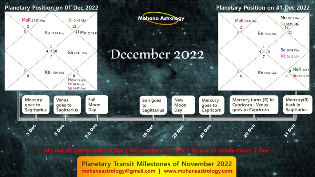 December is a month when all other planets except Mars are in direct motion. Planets are also out of combustion, meaning planets have gained back their health and ready to give results. There still are certain 6/8 positions of planets in the sky, however, I am not getting into too much of technicality and just touching upon the transits and focusing on the results.